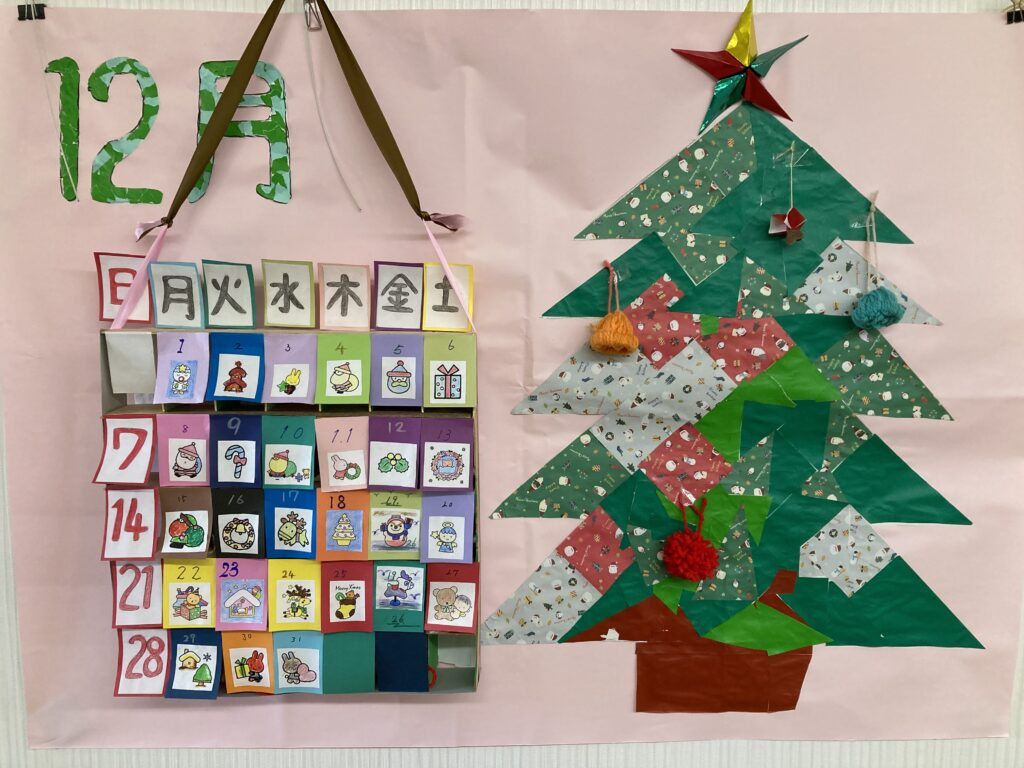 2025年12月、デイサービスの利用者様と一緒に作ったアドベントカレンダーです。毎日日めくりして、中からお楽しみの品を取り出していました。